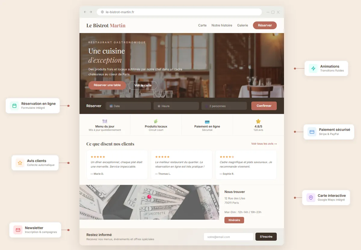 Tout type : réservation en ligne, espace client, tableaux de bord, intégrations API, chatbot, etc.
